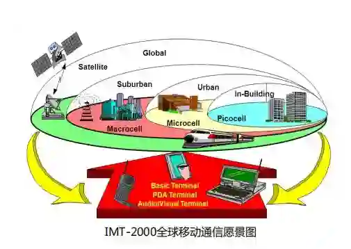 在2G到3G的过渡阶段,各国陆地移动通信系统可以说“七国八制”,目标想法也不尽一致。1996年,在ITU(国际电信联盟)带领下,产生了大家达成共识的通信系统构建蓝图——IMT-2000,也就是3G第三代移动通信系统。后面的4G,5G实际上就是在IMT-2000基础上的演进, 4G命名为IMT-Advanced,5G命名为IMT-2020。
