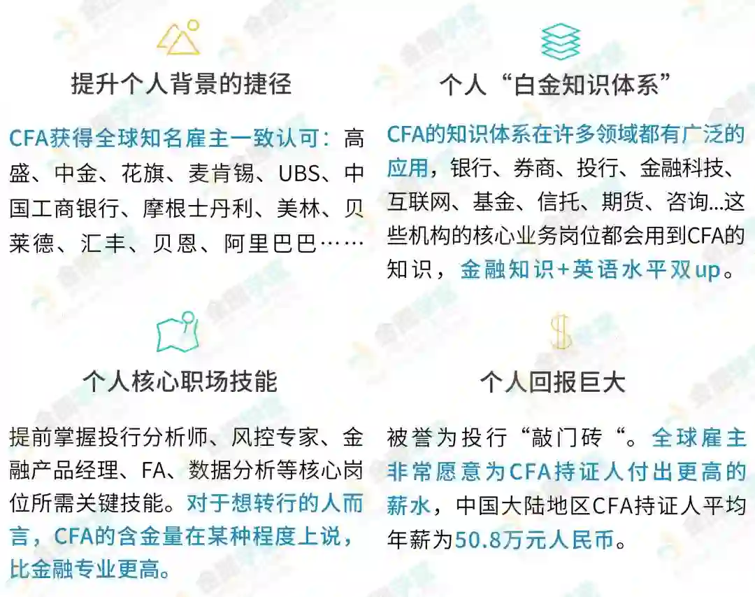 据官方调查显示,世界顶级投行,高盛、摩根士丹利和摩根大通内,39%的CFA持证人已是副总裁。