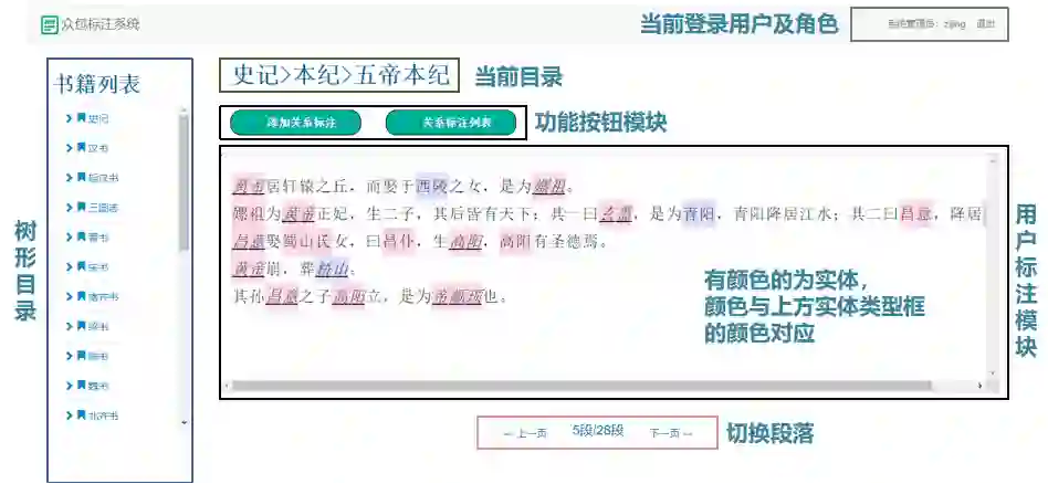 “二十四史”是中国古代各朝撰写的二十四部史书的总称,记录了丰富的历史人物和事件。由于古代汉语和现代汉语在语义和语法上存在较大差异,识别史书中的实体和关系耗时耗力,因此我们利用群体智慧,采用众包标注系统,并通过引入领域知识来实现高效准确的标注。根据系统的标注结果,可以得到一系列的实体和关系来构建文言文语言理解测评基准及数据集。