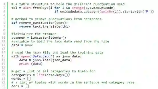 上面我们创建了一个具有五个类别的简单JSON类(time,sorry,greeting,farewell 和age)。对于每一种类别,我们都有一些对应的句子用于训练模型。有了这些数据,我们必须将任何句子归于与以上五类中的一类。