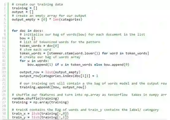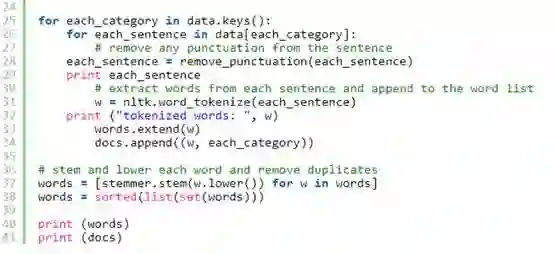 在上面的代码中,我们创建了多个列表。words列表包含有从所有用于训练的句子中提取出来的具有唯一性的词语。Categories列表包含所有的类别。