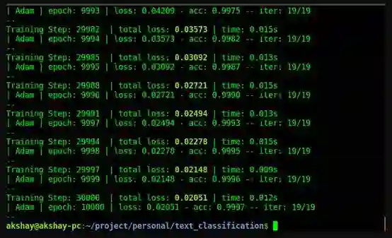 仅仅通过以上训练,我们的模型已经能够正确的对句子进行分类了。当然,模型还会对很多句子不能正确分类。因为用于训练的数据太少了。随着训练数据的增多,我们的模型可行度将越来越高。