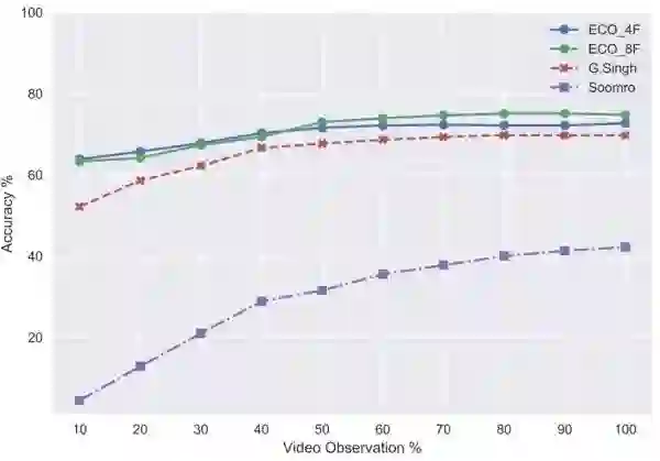 在线视频分类问题通常以 early action recognition 的形式来评估。如上图所示,横轴显示的是可以看到的视频的前百分之几,纵轴则是对应的精度。基于上图的在 J-HMDB 数据集上的实验,可以看出 ECO 在精度上有明显的优势,并且只需要很小一部分视频就可以达到不错的精度。