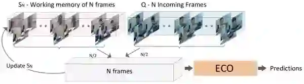 因此,作者基于 ECO 提出了以下的 online 处理框架。这个框架中主要维护了两个图像组,分别是存放较旧图像的工作记忆组和存放新的未处理图像的新收图像组。每次预测时,从两组视频中各采样一半来更新工作记忆组,并将其作为网络的输入得到当前的预测结果,将当前的预测结果和平均预测结果进行平均后得到最终的输出。这个框架在工作记忆组和平均输出两个层面保存了较长时程的信息,但同时依旧是以当前的图像为主。可以说是设计的很精巧的一个框架了。