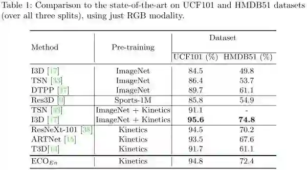 ECO 和 TSN 的不同点:TSN 中直接用 late-fusion 的方式对每个 segment 的结果做融合,而 ECO 中则是进行了 feature map 层面的融合(文中除了 3D 卷积,也采用了 2D 卷积)。此外 ECO 的速度要远快于 TSN。