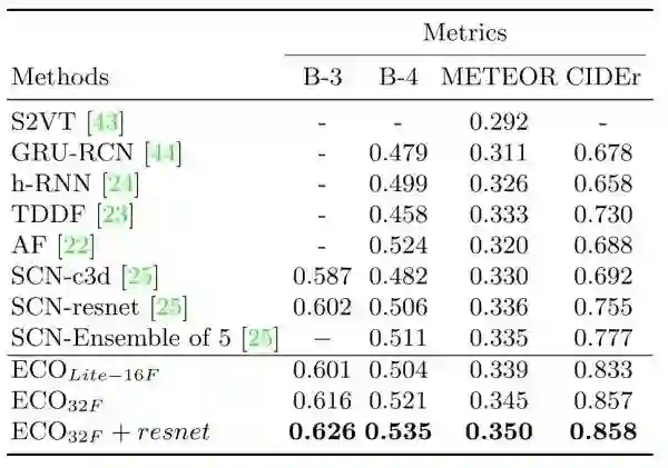 为了展现 ECO 可以被广泛应用于视频理解领域,作者还用 ECO 提取的特征在 video captioning 任务上做了实验(在 MSVD 数据集上)。将 SOTA 方法(即表中的 SCN)的特征换为 ECO,立马获得了非常显著的效果提升,这也表明了 ECO 的有效性。