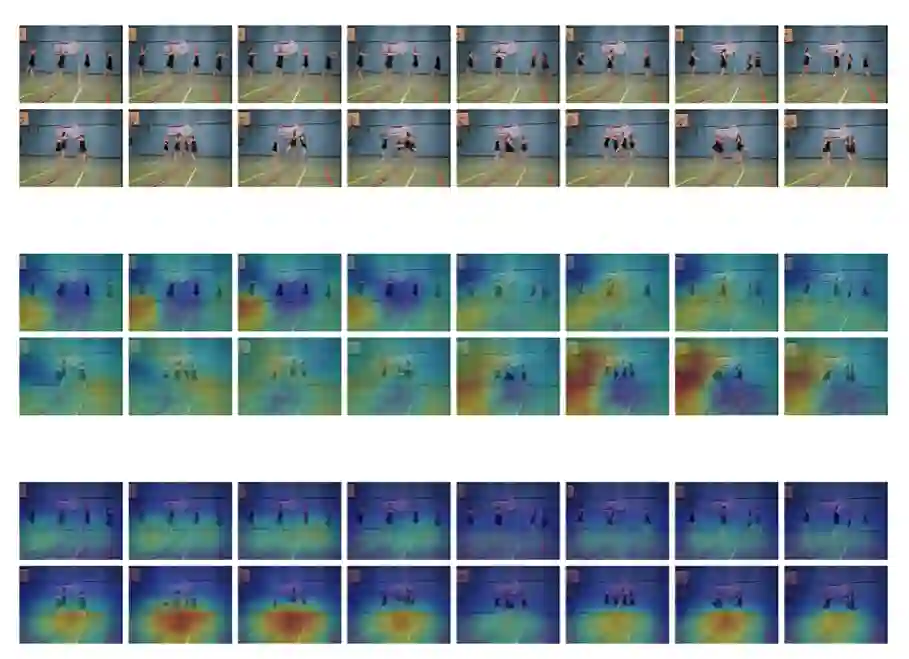 可视化的结果,第一行为 RGB 视频,第二行为 TSN+I3D-S, 第三行为 V4D