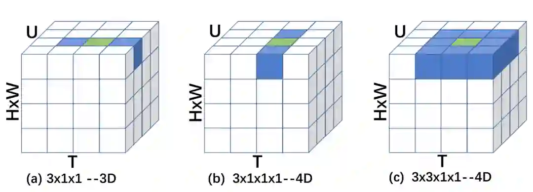 此外,在图 2 中我们可视化了几种 4D 卷积核的行为并与 3D 卷积核进行了对比,图中蓝色表示卷积核,绿色表示卷积核的中心。
