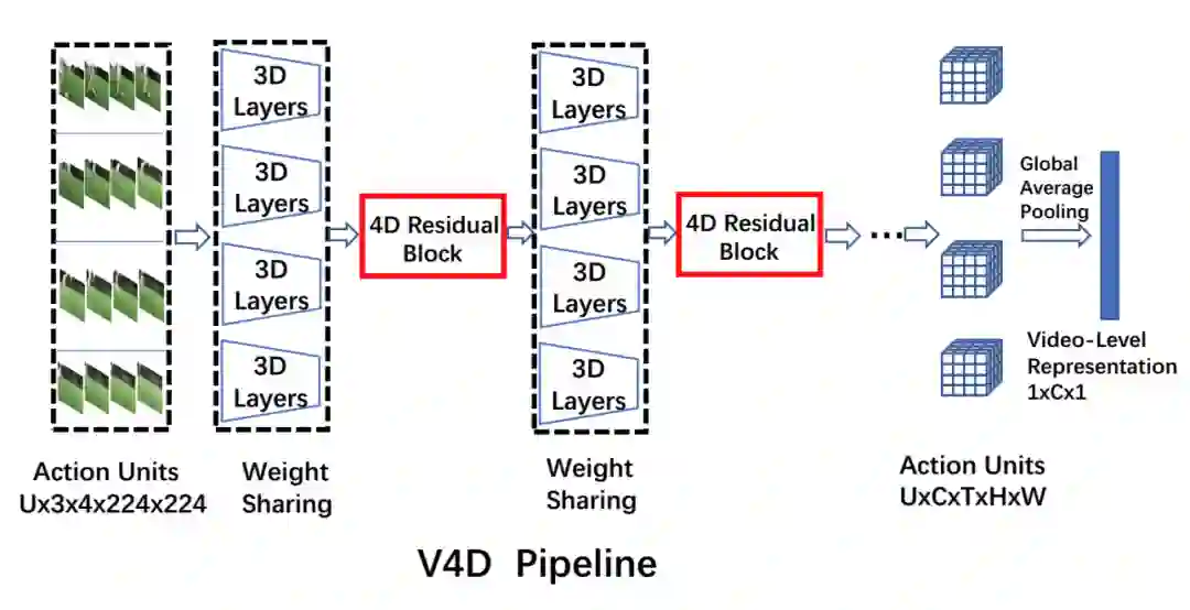 训练方法:如图 1 所示,网络的卷积部分由 3D 卷积层和提出的残差 4D 块组成。每个动作单元在共享相同参数的三维卷积层中分别和并行地训练。从每个动作单元计算出的这些单独的 3D 特征然后被输入到残差 4D 块中,以模拟连续动作单元的长期时间演化。最后,对所有动作单元的序列应用全局平均池,形成视频级表示。