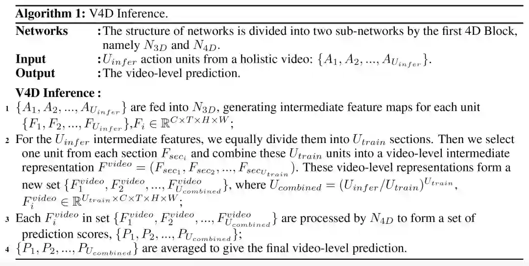 本文提出了一个通用的、灵活的视频级表示学习框架 V4D,如图 1 所示。V4D 由两个关键设计组成:(1)整体采样策略;(2)4D 卷积交互。我们首先通过引入视频级采样策略,对覆盖整个视频的一系列 short-term 单元进行均匀采样。然后,通过设计 4D 残差块,对长程时空依赖性进行建模。4D 残差块可以很容易地集成到现有的 3D CNN 中,比 TSN 更早和更结构化地进行远程建模。我们还为 V4D 设计了一个特定的视频级推理算法。具体来说,我们在三个视频动作识别基准上验证了 V4D 的有效性: Mini-Kinetics-200、Kinetics-400 和 Something-Something-V1。V4D 结构在这些基准上实现了非常有竞争力的性能,并比 3D CNN 获得了提升。