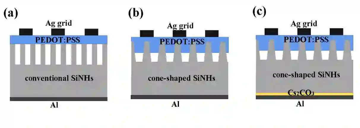 图1. 晶体硅/PEDOT:PSS杂化太阳电池结构图。(a)传统硅纳米洞结构,(b)纳米洞结构,(c)纳米洞结构结合碳酸铯钝化层。