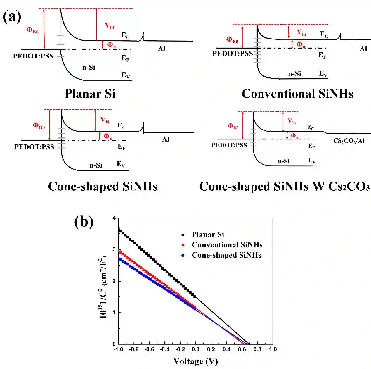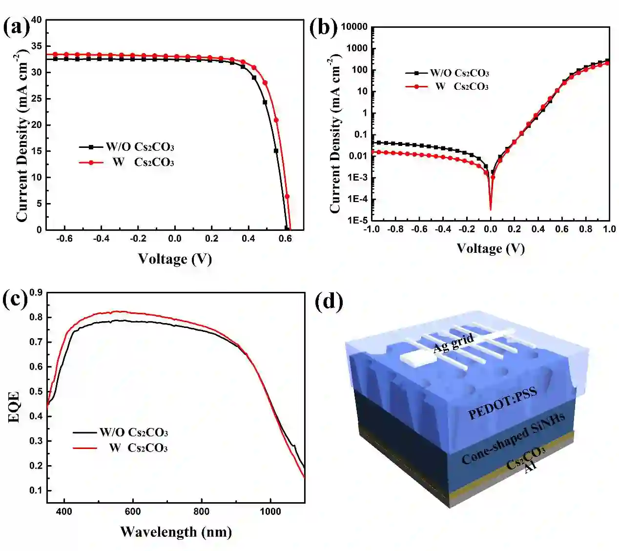 为了解决上述两个问题,并获得高性能有机/无机杂化太阳能电池,兰州大学物理科学与技术学院彭尚龙教授和美国华盛顿大学曹国忠教授合作开展了相关的研究工作,其研究成果发表在期刊《Nano Energy》上 (题目为High-Performance Si/Organic Hybrid Solar Cells using A Novel Cone-shaped Si Nanoholes Structures and Back Surface Passivation Layer, 文章链接: https://doi.org/10.1016/j.nanoen.2017.10.011)。该研究工作采用金属辅助腐蚀的方法获得不同孔径以及深度的硅纳米洞结构,通过研究工艺参数对材料和器件性能的影响,最终选用一种最优的锥状纳米结构作为电池材料结构。同时为了减少背电极和硅之间的载流子复合,在它们之间生长一层碳酸铯(Cs2CO3)钝化层。通过这两种改进,使得基于纳米洞阵列结构的有机/无机杂化电池转换效率达到了13.5%,电池的开路电压(VOC)和短路电流密度(JSC)有了很大的提升。此方法将为纳米结构硅基有机/无机杂化电池的研究提供新的研究思路。目前我们将此类太阳能电池和柔性具有高能量密度的超级电容器集合起来,有望实现柔性高效集能量转换与存储为一体的器件,相关的研究工作正在进行中。