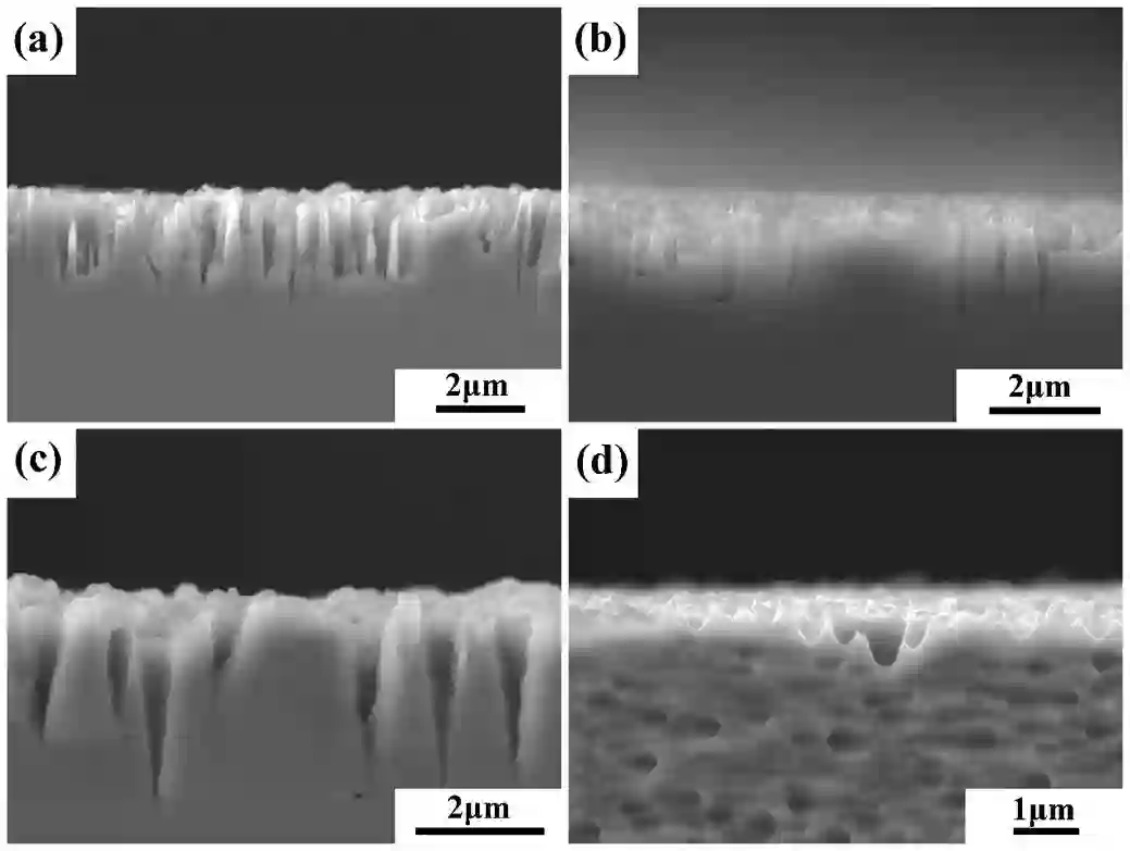 图3不同过氧化氢浓度腐蚀液所得硅纳米结构断面SEM图 (a) 0.4 M, (b) 2 M, (c) 4 M, (d) 6 M。