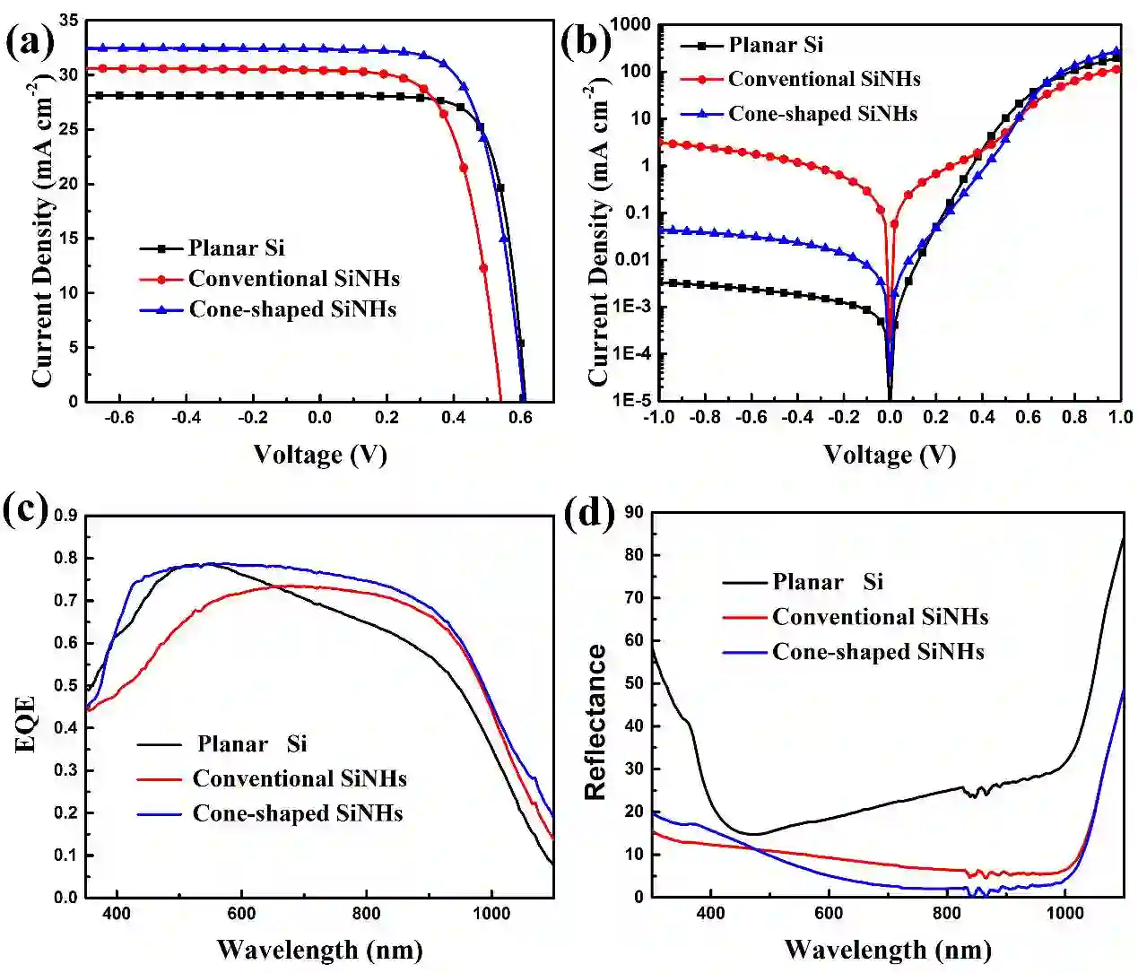 图6 不同硅结构杂化太阳能电池光电性能 (a)光照条件下电流密度-电压曲线,(b)无光照条件下电流密度-电压曲线,(c)外量子效率曲线,(d)反射率曲线。