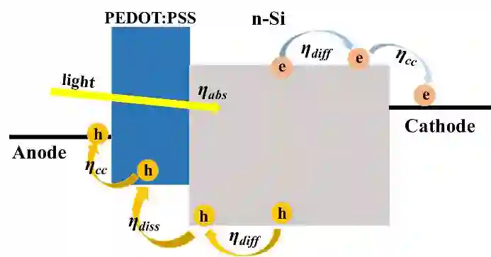 常规的有机/无机杂化太阳能电池结构是在单晶硅片上旋涂有机物PEDOT:PSS形成异质结,并在两边热蒸发或丝网印刷银和铝电极。因为平面单晶硅片的反射率较高,所以这种结构对光的吸收效率并不高。为了增强光吸收和减少对硅的使用量,硅纳米线、硅纳米锥和硅金字塔等纳米结构被用来作为陷光结构,但是这些结构使得硅和有机物之间的接触变差,极大地降低了电池转换效率。同时,N型硅与背电极接触不好导致载流子复合增强,也影响了电池转换效率。