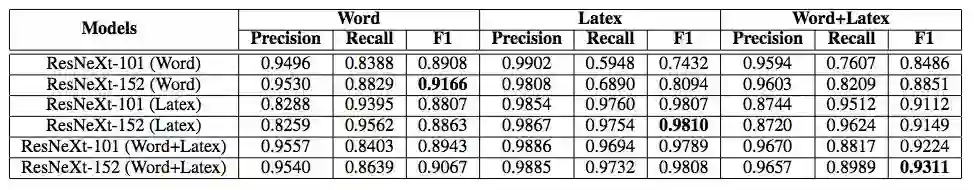 表 2:使用 ResNeXt-{101,152} 作为骨干网络对 Word 和 Latex 数据集的评估结果。