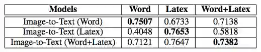 表 3:图像-文本模型在 Word 和 Latex 数据集上的评估结果(BLEU)。