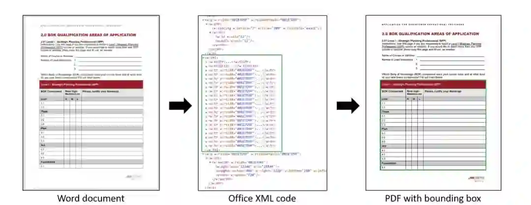 研究者从网上抓取 Word 文档。这些文档都是 .docx 格式,因此研究者可以通过编辑内部 Office XML 代码来添加边框。研究者并未过滤文档语言,因此这些文档包含英语、中文、日语、阿拉伯语和其他语言。这使得该数据集在实际应用中更多样化、更稳健。