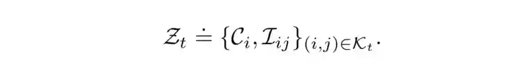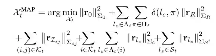 作者的系统输入包括来自摄像机和IMU的测量。 将关键帧i处的图像测量值定义为C_i。 相机可以观察到多个路标点l,因此C_i包含多个图像测量z_{li},其中,区分将用于进一步结构规律的路标点l_c(其中c代表“受约束的”路标点),以及无结构的保留路标点l_s(s代表“无结构规律的”)。 将在两个连续关键帧i和j之间获得的IMU测量值集合表示为I_{ij}。 因此,将时间t内所有的测量集合定义为Z_t: