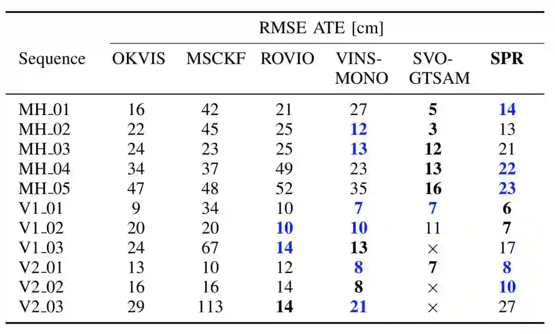 为评估所提出方法的优点,作者比较了三种递进式构建的方法。首先,S表示为仅使用无结构因子的方法。 其次,SP表示为使用无结构因子的方法,并结合共面约束的路标点的投影因子,但不使用规则因子。最后,SPR表示使用无结构,投影和正则因子。IMU因子在三种方法中都有使用。还将结果与一些最先进的算法实现进行了比较。但请注意,这些算法使用单目相机,而作者使用立体相机。所有的算法都没有使用回环。