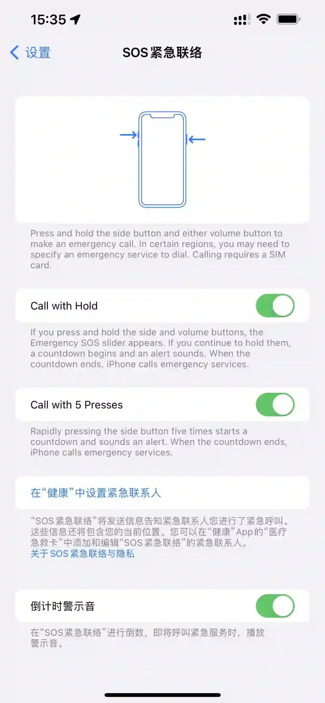 第三处更新了紧急呼叫功能。在 iPhone X 及之后的全面屏机型中,需要同时按住侧边按钮和电源键才可以触发紧急呼叫功能。iOS 15.2 中对这个功能进行了优化,能够用“同时按住侧边和电源键”或“多次快速按下侧边按钮”来触发紧急呼叫功能。