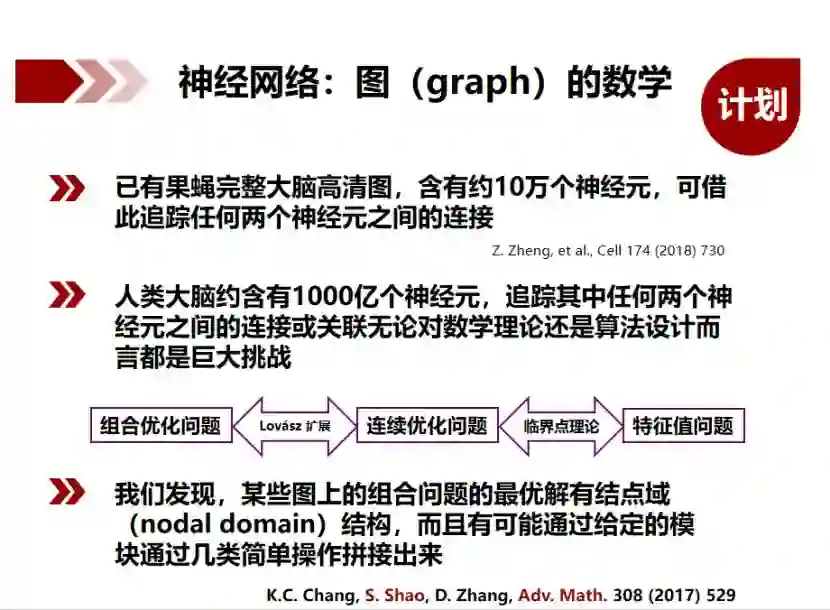 北京大学副教授邵嗣烘带来了《面向智能的数学》主题报告,探讨在脑神经⽹络上建⽴数学模型来剖析由物质世界的物理定律演变成思想世界的意识智能的过程。现在谈到网络,很多人会在计算机里做成一张图、一些点,画边连起来。但如果你用这个方法去研究人的大脑,生成的图会非常庞大。前者是一条连续的线;后者则是一个个离散的点,这二者虽然都叫数学,但离散数学更多是在计算机这边关注,连续数学就是大家常说的那一类。邵嗣烘的观点是,应该有一个更大的框架,把这两个东西放在一起考虑。他自己做的工作就是把一些离散的东西通过某一种变化变成连续的东西,因为连续的数学里面有很多很强大的工具,有这么多年的积累可以使用,只要转化过来,就可以尝试通过其中的工具解决问题。