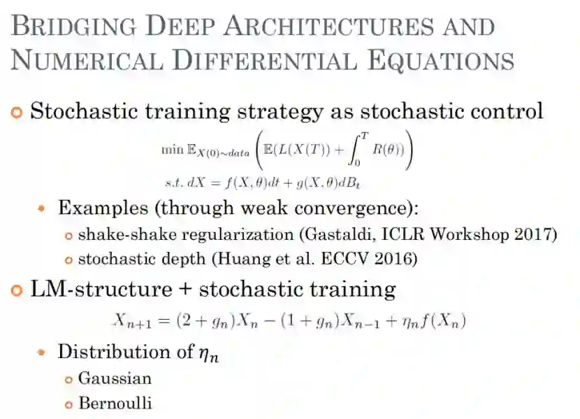 除此之外,深度学习训练时还会遇到各种随机扰动,这可提升训练效果。如果在训练时加上一些随机扰动,比如随机加一些噪声,那么其对应的动力系统是什么,自然而然地会想到随机偏微分方程。到底是不是呢?有两个例子,一个是 shake-shake,一个是 stochastic depth,都是对于残差网络设计的随机扰动训练。