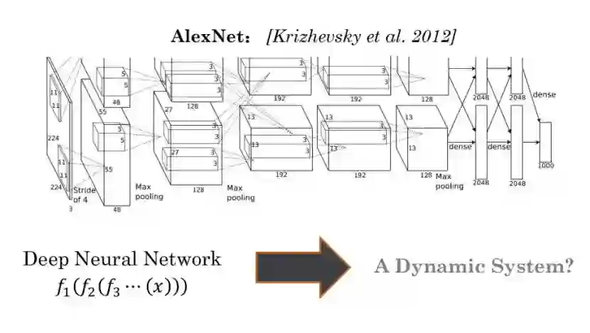 我们先来看 DNN(深度神经网络,主要是卷积网络)和数值 ODE 之间的关系。以 AlexNet 为例,若要用数学形式写出,可以将其看作一个动力系统,但是这样的动力系统很难分析,因为缺少特殊结构,这样一般形式的动力系统不知该如何入手。