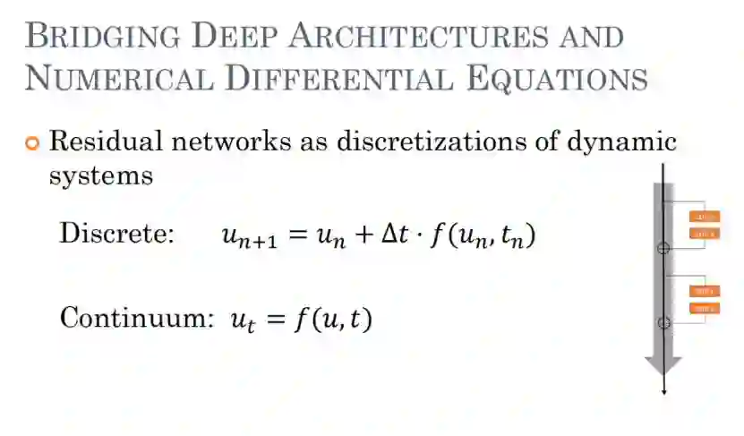 相比之下,如果把残差网络的数学形式写出来,就很容易看出它是对下面这连续的 ODE 基于时间做了前向欧拉离散,只不过在网络设计时把 Δt 设成了 1。有些工作已经发现,把 Δt 设得更小,训练反而更加稳定。