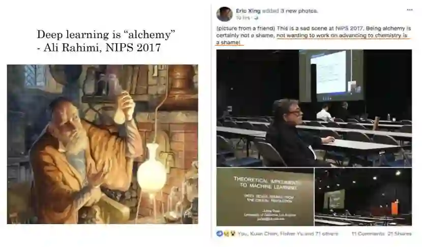 据 Google Trends 数据显示,自 2015 年起,深度学习的关键词搜索频率开始呈快速上升趋势。除却 AlphaGo 等里程碑式的优秀成果之外,深度学习也不可避免地存在着诸多问题,Ali Rahimi 在2017年的NIPS颁奖礼上就曾做过一个报告,提到“Deep learning is ‘alchemy’” ,这里的“alchemy”就是所谓的炼金术,很多人都认为深度学习就像炼丹一样,把你的 formula 塞进去过个几个小时或者一两天才能看到结果,但却不知道下一步应该怎么调,只能通过尝试。
