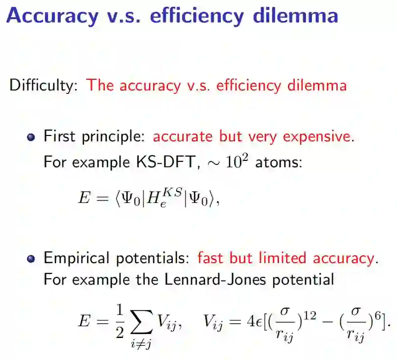 稍微回顾一下分子建模或解能量函数E的传统方法,包括两种套路,其一是从头算,就是把体系中的电子结构给解出来,就像刚才邵老师讲的,从学薛定谔方程出发,把体系中所有电子的结构解出来,这样的话自然就获得能量函数 E。其优点在于出发的模型几乎没有任何假设,能量 E 可以解得非常精确,甚至和实验对得非常好;缺点则是非常昂贵的,典型的大家能够算得起的体系实在是太小了。另外一种套路就是经典力场建模,假设E有某种比较简单的函数形式,实际上是显式的函数形式,当然里面带了一些参数。我猜出这种函数形式,然后我去套参数,使得这个 E 尽可能的靠谱。这么做的好处当然是快,但是缺点就是精度非常有限。而我们的思路就是用深度学习去解决这个问题,我们希望达到的目标就是能够在保证第一性原理计算的精度条件下,做到计算开销和经典力场尽可能合并。