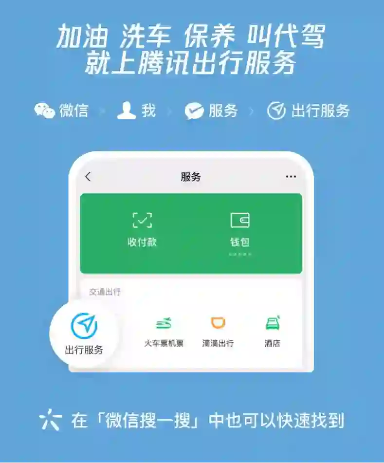 但随着腾讯出行切入聚合打车平台,滴滴在微信的打车“C位”被取代。用户可以在微信“服务”——“交通出行”——“出行服务”中找到打车选项,位置在滴滴前列。