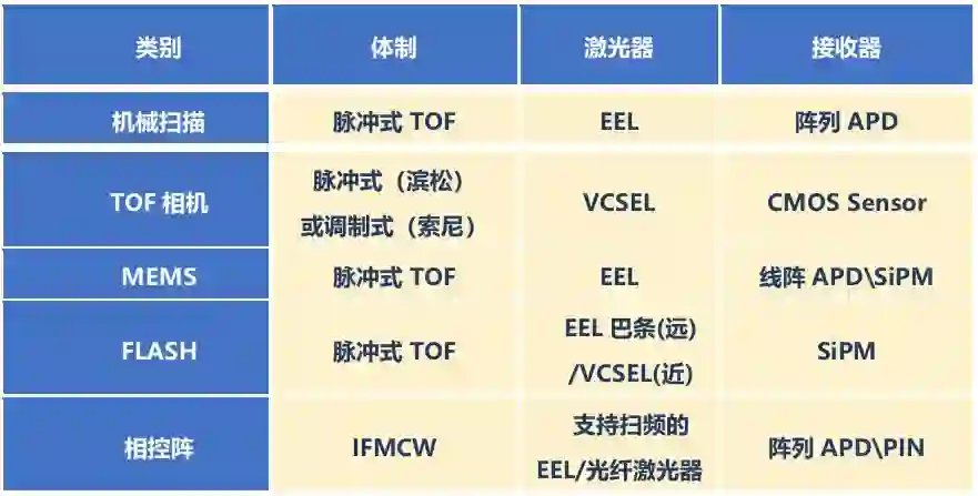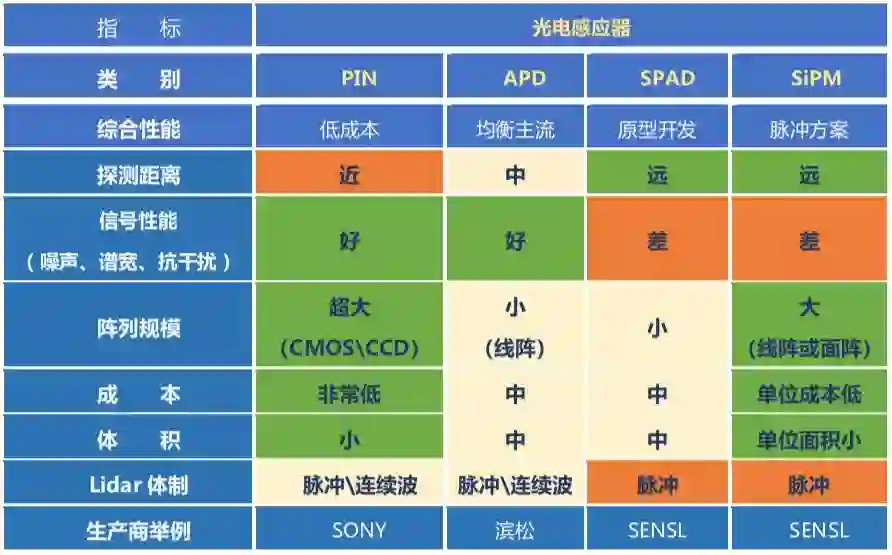 接收探测器有 PIN、APD(雪崩二极管)、SiPM(硅光电倍增管)、SPAD(单光子雪崩二极管)等等。