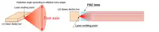 光学系统主要作用包括准直和分光。所谓激光,就是受激辐射产生的光。激光形成的时候,并不是直直的一束,和手电筒产生的光一样,也是发散的。激光发射出来的时候,其发散角度有 8(慢轴)到 30 度(快轴),要通过光学系统将束散角控制到 mrad(0.1°)这个量级,才能有效的聚集能量。对于要求高的激光器,甚至需要通过光纤进行准直。