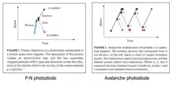早期的机械式激光雷达采用 APD 为主,APD 是可以是硅也可以是 III-V 材料制成。他是一种 p-n 结型的光检测二极管,其中利用了载流子的雪崩倍增效应来放大光电信号以提高检测的灵敏度。主要缺点是偏置电压高,增益一般小于 100,APD 对热和磁都比较敏感。III-V 材料的灵敏度要高于 Si 材料,频段也不同。