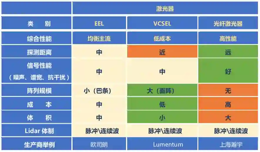 半导体激光器,目前主流的产品有 EEL\VCSEL\ 光纤激光器。EEL 为边发光激光器, VCSEL 为面发光激光器。