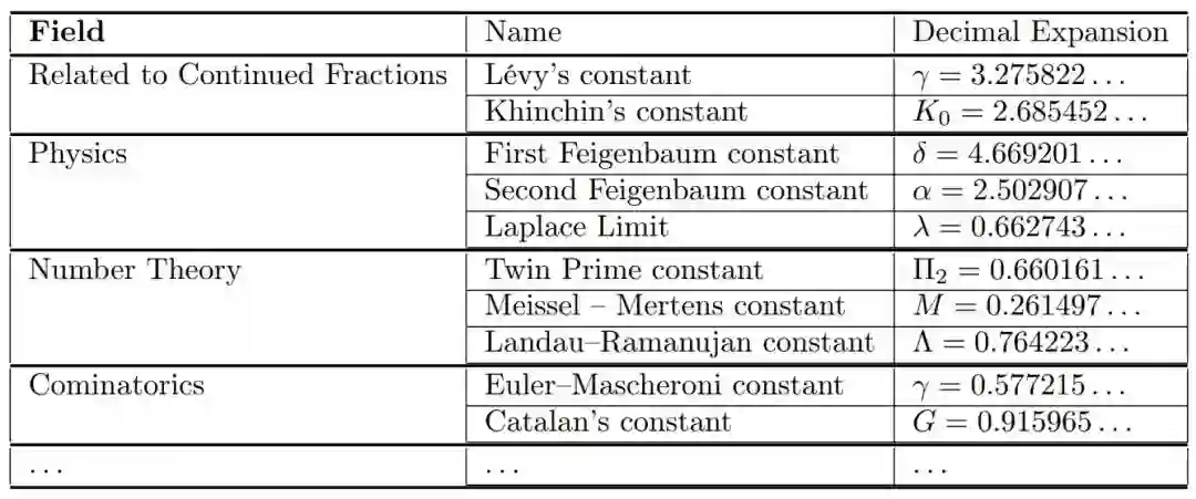 表 2:来自不同领域的基本常数示例,这些都是本文方法的相关目标。
