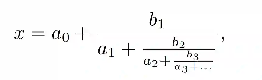 如图,b_n ∈ Z,n = 1, 2, . . .,分别是部分分子和分母。广义连续分数中的这种分子和分母的多项式表达方式是数学界几个世纪以来一直研究的问题。