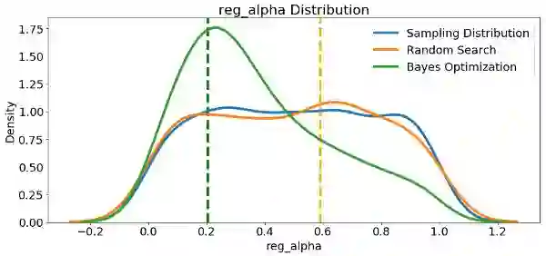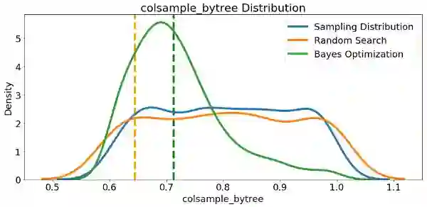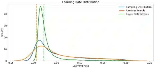 首先,我们可以制作随机搜索和贝叶斯优化中采样的learning_rate的核密度估计图。作为参考,我们还可以显示采样分布。垂直虚线表示学习率的最佳值(根据交叉验证)。