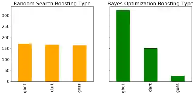 另一个超参数是增强类型,在随机搜索和贝叶斯优化期间评估每种类型的条形图。 由于随机搜索不关注过去的结果,我们预计每种增强类型的使用次数大致相同。
