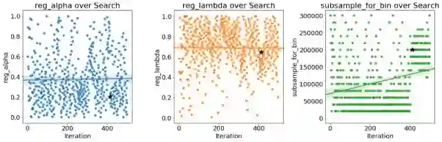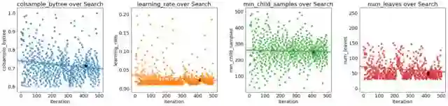 黑星表示最佳值。 colsamplebytree和learningrate会随着时间的推移而减少,这可能会指导我们未来的搜索。