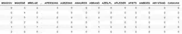 在本例中,我们将使用Caravan Insurance数据集,其目标是预测客户是否购买保险单。 这是一个有监督分类问题,训练集和测试集的大小分别为5800和4000。评估性能的指标是AUC(曲线下面积)评估准则和ROC(receiver operating characteristic,以真阳率和假阳率为坐标轴的曲线图)曲线,ROC AUC越高表示模型越好。 数据集如下所示: