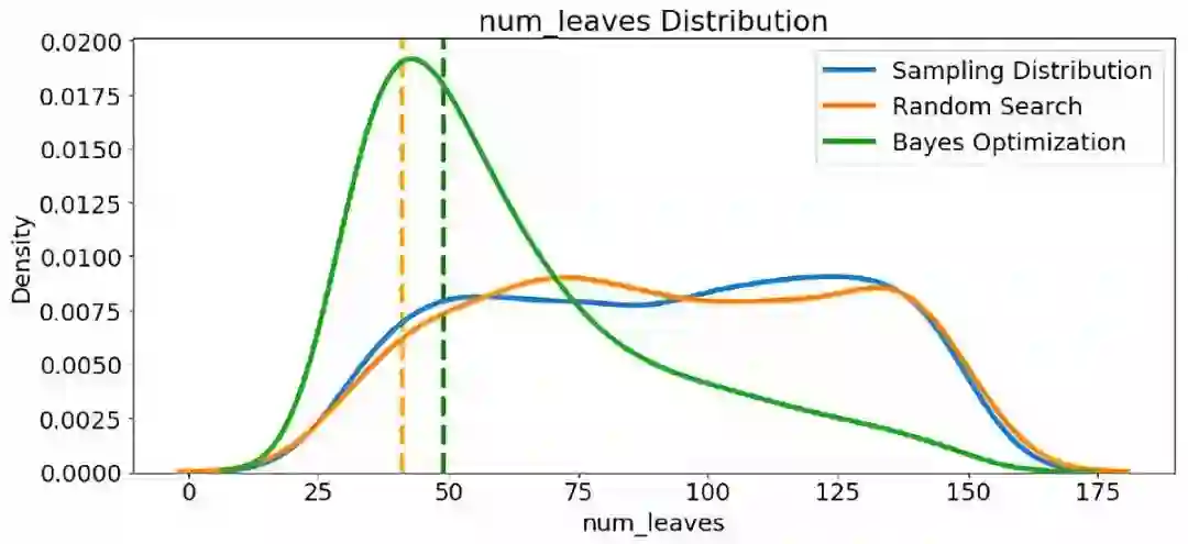 由于我们有它们,让我们看看参考分布,随机搜索和贝叶斯优化中的所有数字超参数。 垂直线再次表示每次搜索的超参数的最佳值: