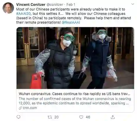今年大会的程序主席Vincent Conitzer2月1日在推特上表示,将允许中国参会者远程参会。