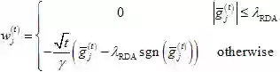 由于直接优化引入L1正则项的目标函数较为困难,为此Xiao于2009年在NIPS上提出L1-RDA算法,其核心思想为:通过Bregman距离(Bregman Divergence)构造对公式2的对偶形式,通过对对偶形式的优化求解结果(具体的对偶求解过程略)。RDA算法可以描述为: