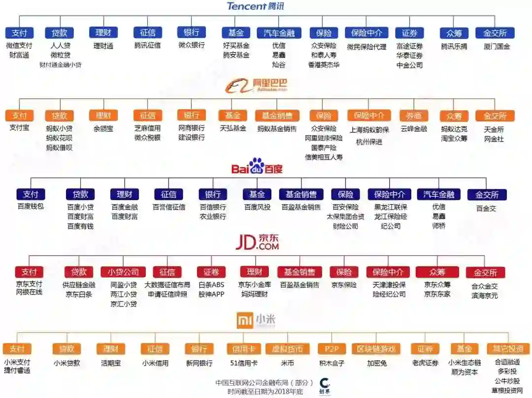 BAT等中国互联网巨头在金融布局上特点是大而全,金融产业一条龙服务,从头吃到尾。包括支付、信用、保险、券商、个人小额贷款、理财等无孔不入。