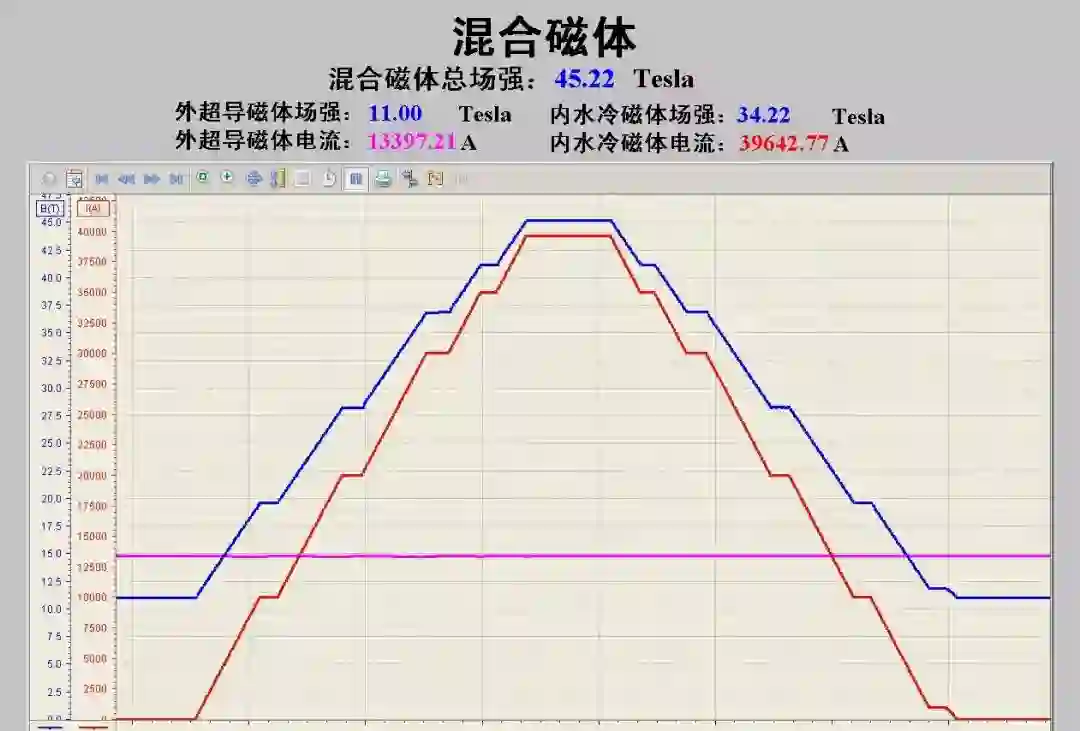 2016 年,强磁场团队自主研制成功中心场强达 40 万高斯的混合磁体,一举跻身世界第二。在合肥综合性国家科学中心强光磁预研项目的支持下,经过五年多紧张的技术攻关,强磁场团队创新了磁体结构、研发了新材料、优化了制造工艺,终于取得重大技术突破。此次国家稳态强磁场实验装置的混合磁体在 26.9 兆瓦的电源功率下产生 45.22 万高斯的稳态强磁场,达到国际领先水平。