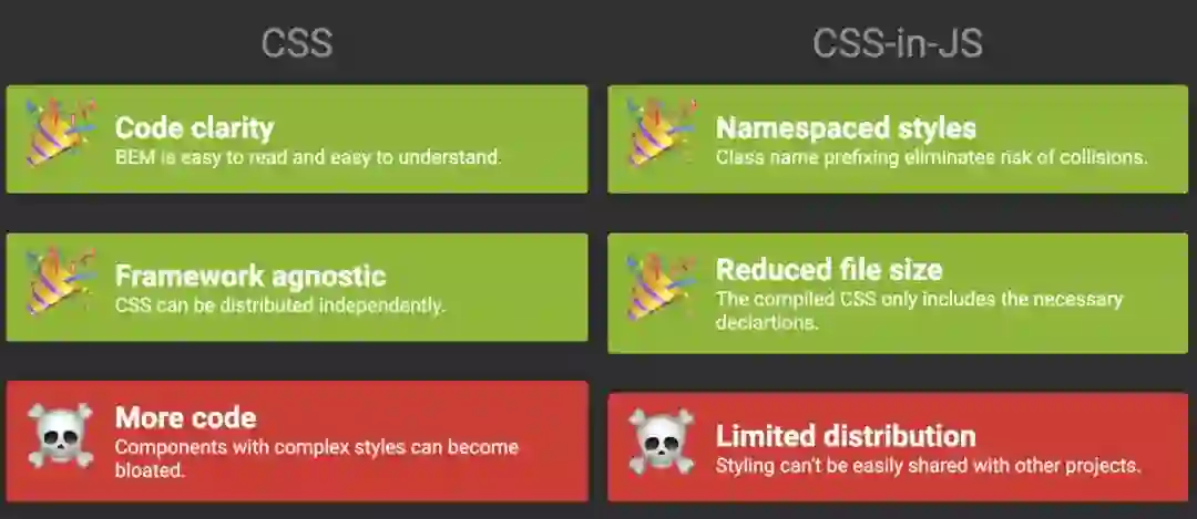 如果你使用 JavaScript 框架来构建包含组件的 Web 应用程序,那么 CSS-in-JS 可能非常适合你的需求。如果你的团队成员都具备基本的 JavaScript 能力那就最好不过了。