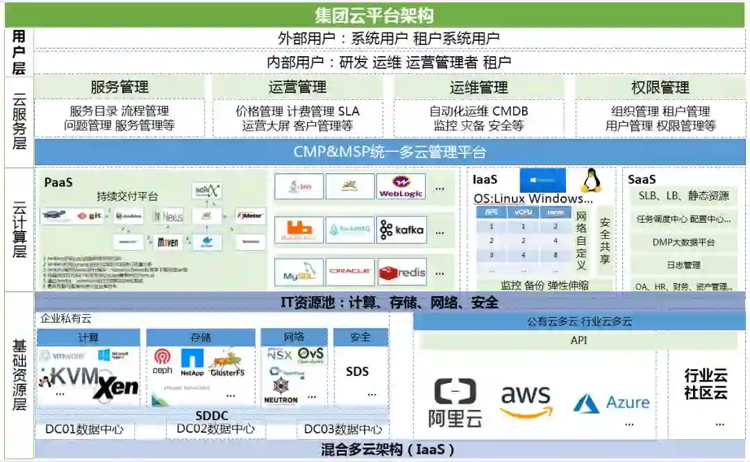简单来说,IaaS层是以资源为核心的;而PaaS层则是以应用为核心。那SaaS呢?个人感觉SaaS是以用户为核心的。IaaS纳管多个平台的资源,这个现在来讲不难,大多厂商是可以实现的,并且基于资源池建立的服务目录如虚拟机创建、变更、常用服务器创建等。
