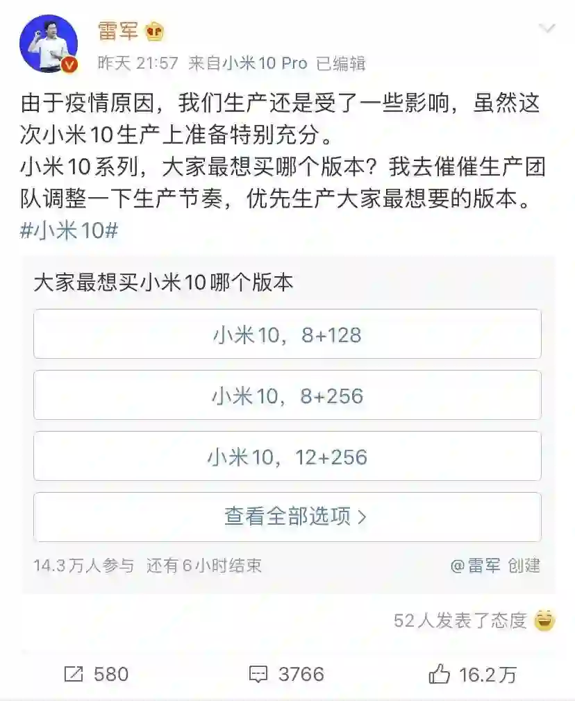【雷军:疫情影响了小米的生产 正加快小米10系列供货】2月22日消息,雷军在微博上表示,疫情影响了小米的生产工作,他们正在努力催小米10系列的供货,希望大家能够体谅。雷军称,由于疫情原因,小米的生产还是受了一些影响,虽然这次小米10生产上准备特别充分,同时他还发起了投票,询问大家最想买小米10系列哪个版本?以便自己看好去催催生产团队,调整一下生产节奏,优先供应大家最想要的版本。(硅谷分析师)